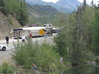 So, we are back on the road. Picked up the bikes at "House of Harley" Cudo's to the dealership in general and especially Richard in service. He is one of the best fellow's in this position we have found in the country, (Yes, Ronnie and team at American Eagle- you will always be our favorites). 1 hour out of Anchorage it was Halt, the road is closed. A gravel hauler turned over in a turn on the mountian road over to Tok. The road was spectacular, and the glaciers and view back to Anchorage was unbelievable. As mentioned we had a chance to testify our way through the 1 or so long mile of traffic meeting loads of friendly people. 4 hours later, the road opened and we were off. The rest of the day was nice, and we saw 2 foxes at the edge of the woods at dusk. God has protected us and blessed us each day. Now I know He does at home, but for some reason it is much more clear to Tim and me on the road like this. Thanks to everyone for your prayers, they are felt. On this day, 1. we were not in the accident. 2. it provided us a chance to testify to many nice people who were willing to talk and listen as everyone had nothing else to do for 4 hours. 3. We were well rested from our break and were able to easily press-on to our destination. 4. The motel had a good restaurant that stayed open late, and fed us after a long day. 5. The motel chosen by happenstance was nice and we got a good nites rest.
